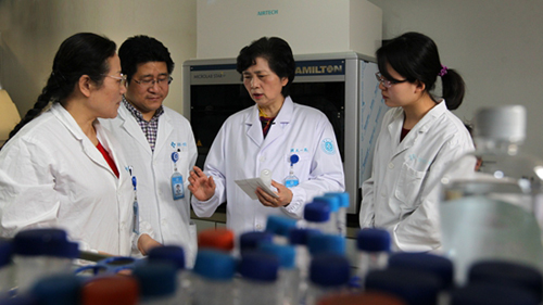 李兰娟院士与项目组成员在讨论。图中左三为李兰娟院士-卢绍庆摄