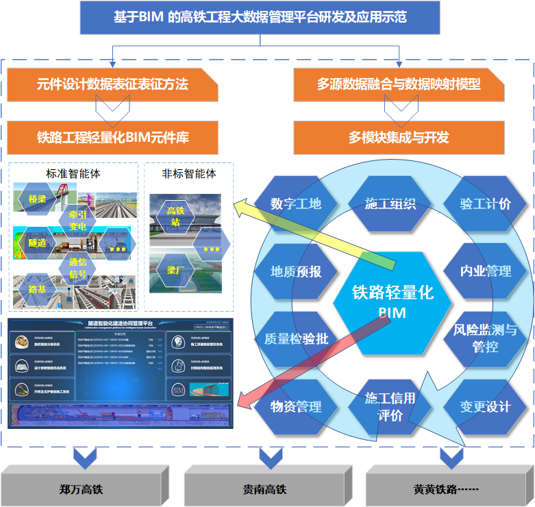 2020年12月24日,贵州省科技厅组织专家组对贵阳同心软件科技有限公司与贵州大学联合研发的“基于BIM的高铁工程大数据管理平台研发及应用示范”进行了验收。该项目以我国在建郑万高铁、黄黄铁路、贵南高铁等基础设施建设为依托,攻克了铁路施工过程中的大规模轻量化BIM定制设计、施工过程多源数据协同管理等关键共性技术问题。开发的桥梁、隧道、路基、四电工程、站房等轻量化BIM参数化定制元件,实现了大规模铁路工程定制;以轻量化BIM元件库为核心,开发的数字工地、施工组织、验工计价、内业管理、变更设计、物资管理、质量检验批、风险管控等施工过程数据管理模块,实现了模块间数据协同与融合;并通过互联网搭建了高铁工程大数据协同管理平台,实现了业主单位、施工单位、监理单位对铁路施工过程数据的精准协同管理,缩短了铁路工程建设周期,降低了工程成本。