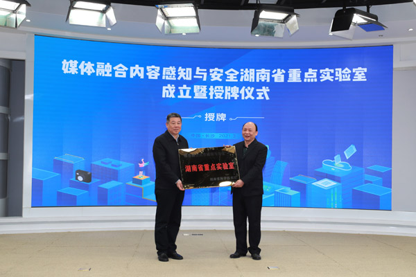 当天还举行了“媒体融合内容感知与安全湖南省重点实验室”授牌仪式,童旭东为实验室授牌。该实验室由湖南日报社与国防科技大学计算机学院联合共建,以人工智能和内容安全研究为核心,围绕大数据舆情感知与内容安全、基于5G技术的云化制作生产和全息通信、国产化替代软件系统在媒体生态适配、县级融媒体中心省级技术平台应用4个方向开展基础研究、应用示范和推广实践。实验室将努力打造媒体融合基础理论和关键技术的科研创新平台,持续研发对媒体融合有重大影响的科技创新成果,并通过湖南日报社各类媒体平台快速进行成果转化。
