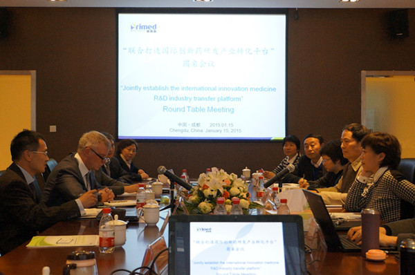 2015年1月15日,四川省科技厅周孟林副厅长与来川考察和洽谈合作的英国国家医学研究院科技部(MRCT)总裁Dave Tapolczay博士一行,就新药研发和成果转化合作事宜进行了商谈。