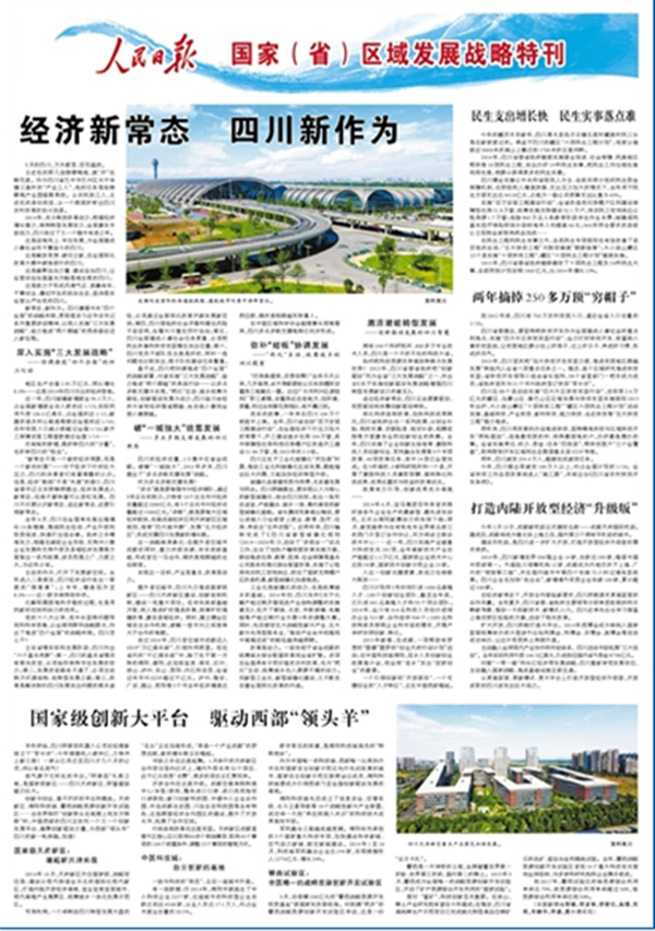 近年来,四川省创新驱动改革发展实践日益受到全国关注。3月16日,人民日报“国家(省)区域发展战略特刊”聚焦经济新常态下的四川新作为,对四川省落实中央“四个全面”的战略布局,深入实施“三大发展战略”,推进创新驱动发展的生动实践作了深入报道。