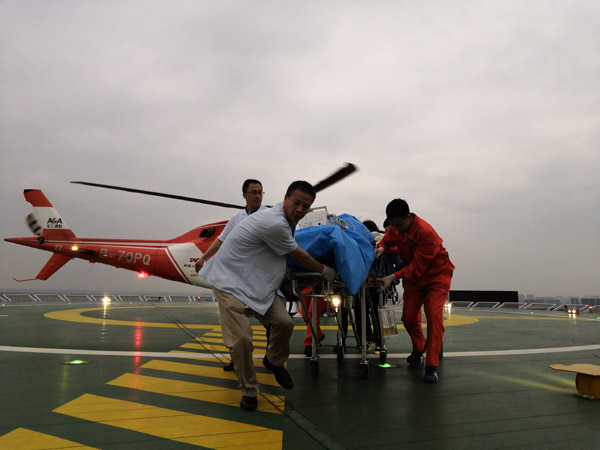 6月18日下午6点33分,运送伤员的AW119专业医疗构型直升机从长宁县中医院顺利抵达成都港泰通航大厦,完成了四川省城市航空医学救援平台第一次救援任务。经全力抢救,伤员已脱离生命危险。