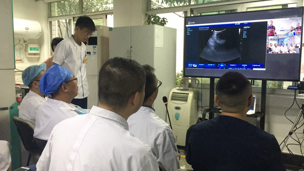 6月18日下午2点,为确保伤员转运途中生命安全,四川省人民医院组织骨科、EICU、急诊外科、超声科、放射科介入中心多学科在急救中心抢救室进行远程大会诊,对伤员是否能通过航空转运进行了细致评估。通过会诊发现伤员双侧胸腔积液,现场立即实施了双侧胸腔闭式引流手术。