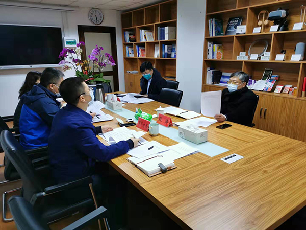 2月6日,青岛市科技局局长吕鹏(左三)向副市长耿涛(右一)汇报疫情防控科技工作