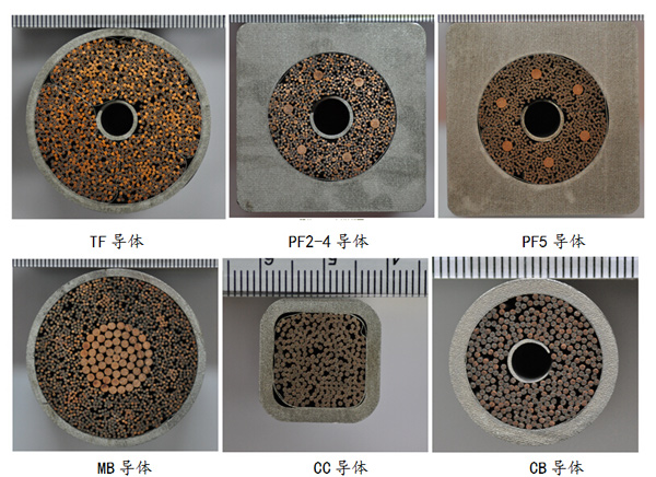 ITER装置为超导托克马克,其中心螺管导体(CS)、环向场导体(TF)、极向场导体(PF)、校正场导体(CC)和磁体馈线导体均为超导导体。ITER七方中的六方(中国、韩国、日本、欧盟、俄罗斯、美国)分别承担了超导导体制造任务。中国是承担导体种类最多的国家,包括7.5% 的TF导体,69%的PF导体,100% 的CC导体及Feeder导体。