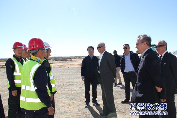 访南期间,王志刚部长一行专程抵达位于南非卡鲁沙漠深部的SKA南非站址核心区,参观了SKA“探路者”计划—MeerKAT射电望远镜站址、天线和数据中心,并现场调研了正在由中方团队承担建设的SKA中频天线样机。