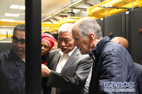 在MeerKAT控制和数据中心,南非技术人员向王志刚部长一行介绍了MeerKAT数据存储、数据处理、波束成型、天线监控等核心单元,以及MeerKAT接收、处理、分析数据的有关情况。王志刚部长向随行中南专家和技术人员了解了有关天线阵列同步控制和观测数据协同处理等问题。