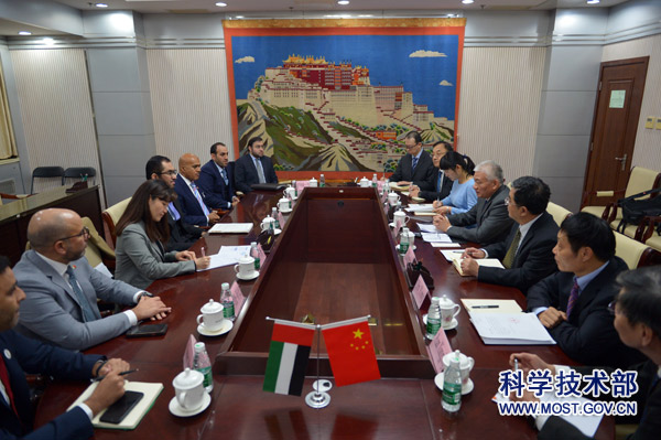 阿联酋驻华大使阿里·奥贝德·扎希里、科技部国际合作司司长叶冬柏、一级巡视员阮湘平、战略规划司司长许倞、高新技术司司长秦勇等陪同参加会见。