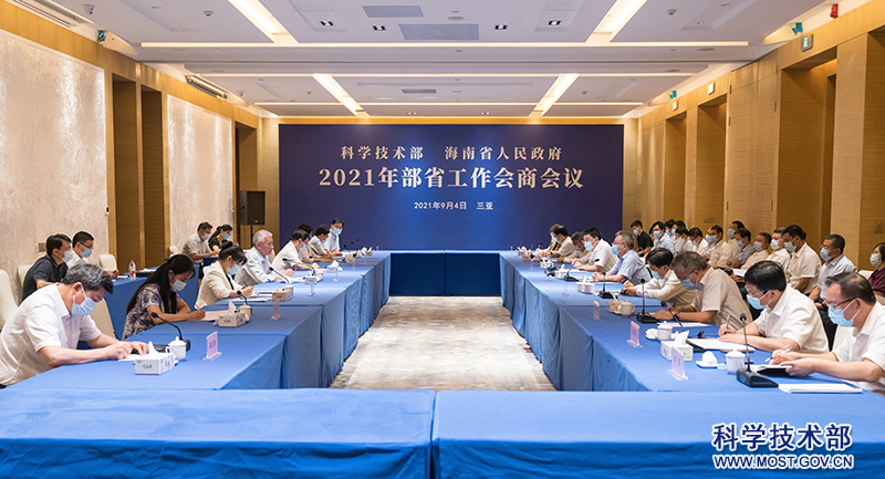 9月4日,科技部与海南省人民政府在三亚举行2021年部省工作会商会议。海南省委书记、省人大常委会主任沈晓明主持会议。科技部党组书记、部长王志刚,海南省委副书记、省长冯飞出席会议并讲话。科技部党组成员、副部长黄卫,海南省副省长刘平治分别报告部省双方对推动本次会商事项的有关情况和意见。海南省委常委、省委秘书长孙大海,省委常委、三亚市委书记周红波,海南省有关部门主要负责同志以及科技部有关司局负责同志出席会议。