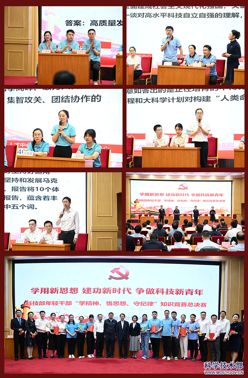 活动在雄壮激昂的共青团歌中拉开帷幕。活动首先举办了科技部年轻干部“学精神 悟思想 守纪律”知识竞赛决赛,成果与区域司、人才中心、遥感中心等5家单位代表本片区,聚焦习近平新时代中国特色社会主义思想、党的二十大精神、党章党规党纪以及党中央对科技创新工作的重大决策部署等应知应会知识进行了角逐。场上参赛选手激烈比拼、场下全体同志共同学习、导师团队互动点评,整场竞赛洋溢着一派欢悦振奋、昂扬向上的氛围。经过紧张激烈角逐,共决出一等奖1名、二等奖和三等奖各2名,部领导、团中央领导以及机关党委有关负责同志为获奖团队颁奖。