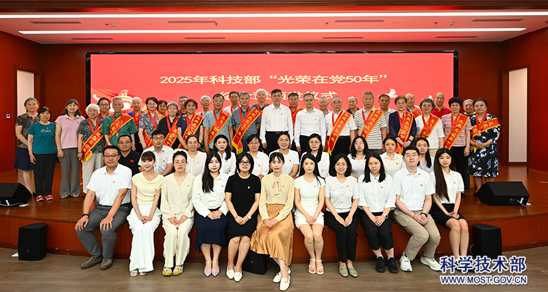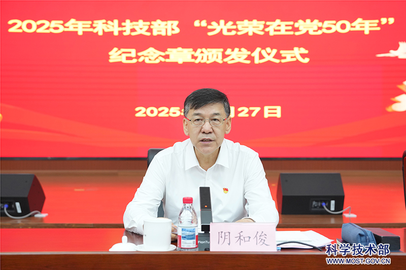 为庆祝中国共产党成立104周年,传承红色基因,弘扬党的优良传统,进一步增强党员干部的荣誉感、归属感和使命感,6月27日上午,科技部举行2025年“光荣在党50年”纪念章颁发仪式。科技部党组书记、部长阴和俊出席并讲话,部党组成员、秘书长潘晓东主持。获颁“光荣在党50年”纪念章老党员代表,各退休干部党支部书记代表,部系统有关单位负责同志,老干部工作者和青年党员干部代表参加。部系统共61名老党员获颁纪念章。