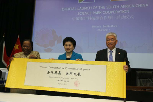 当地时间4月24日下午,刘延东副总理于比勒陀利亚南非科学与产业研发理事会国际会议中心出席了中国南非科技园区合作启动仪式。南非科学技术部部长纳莱迪·潘多尔、中国科学技术部党组书记王志刚一同出席。来自中国9家国家高新区的园区管理者和区内20余家科技企业的代表共50余人,以及来自南非科技部、财政部、贸工部、豪登省以及科技型企业的会议代表在现场见证了这一历史时刻。
