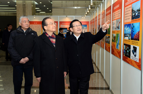 2月21日,国务院总理温家宝在科技部调研。这是温家宝参观科技十年重大成就展。