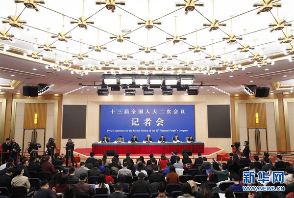 3月11日,十三届全国人大二次会议新闻中心举行记者会,邀请科技部部长王志刚、副部长李萌、战略规划司司长许倞、政策法规与创新体系建设司司长贺德方、资源配置与管理司司长张晓原就“加快建设创新型国家”相关问题回答中外记者提问。 新华社记者 沈伯韩 摄