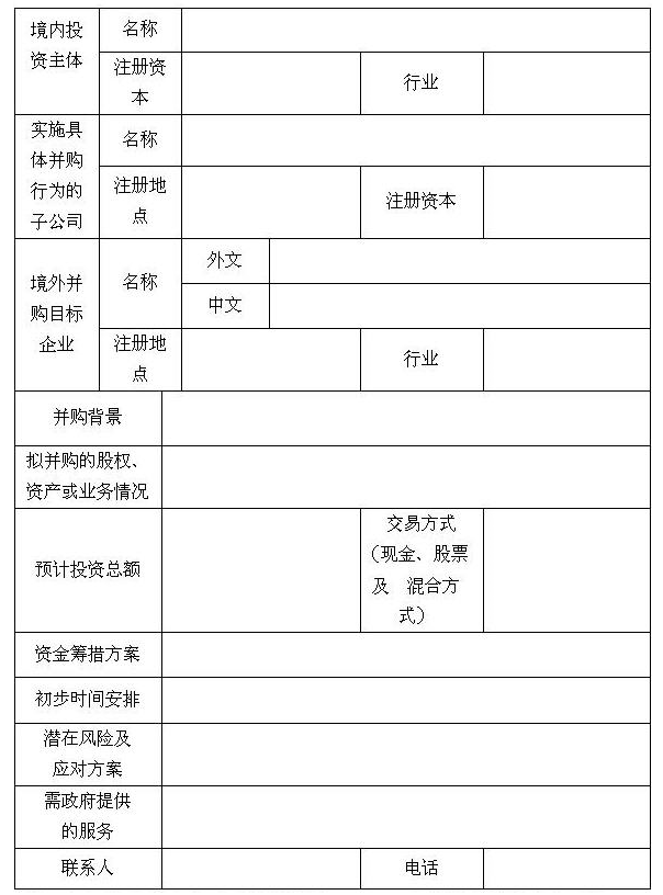 四、企业报告时,需填写并提交《境外并购事项前期报告表》(附后)。