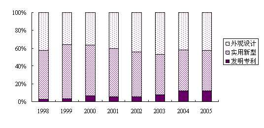 从国内三种专利占总授权量比重的历年变化看,发明专利授权在数量上一直处于最低水平,所占比重从1998年的2.7%上升到2005年的12%,增长速度比较缓慢。可见,在我国授权的专利中,实用新型专利和外观设计专利仍是我国专利授权的主体,发明专利比重低的状况没有根本性改观。