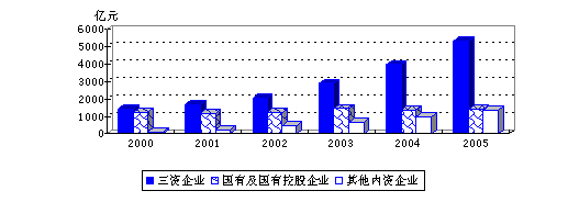 高技术产业中的国有企业进入“十五”以来,产业规模变化不大,2005年实现增加值1422亿元,仅比去年提高了4.8%,“十五”期间国有企业增加值的年均增长率也仅为3.0%。相比之下,三资企业的产业规模呈现了飞速的发展,2005年增加值达到5324亿元,比上年增长33.5%,“十五”期间的年均增长率也达到29.9%。三资企业与国有企业规模发展的巨大差异,使三资企业从“九五”末期与国有企业相当的产业规模,一跃成为我国高技术产业的主体,2005年三资企业的增加值占我国高技术产业总体的比重达到65.5%。2005年其他内资企业的产业规模已经接近国有企业,达到1382亿元,比上年增长38.8%,这些企业也是高技术产业中“十五”期间增长最快的企业类型,5年间平均增速高达70.4%。