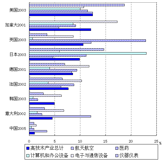 根据美国《科学与工程指标》的最新数据显示,2003年全世界高技术产业工业总产值占制造业的比重在30%以上的国家只有新加坡、马来西亚和美国;在20%-30%之间的国家也只有爱尔兰、芬兰和韩国三个国家;而在15%-20%之间的有6个国家,分别是中国、瑞典、英国、菲律宾、墨西哥和法国。从高技术产业总产值的世界份额来看,2003年我国高技术产业总产值占世界高技术产业总产值的比重高达12.2%,仅次于美国的38.9%和欧盟15国的18.0%,位居世界第三。由此看来,我国的高技术产业不仅在制造业中的比重已具有一定规模,其规模在世界上也已具有较高地位。