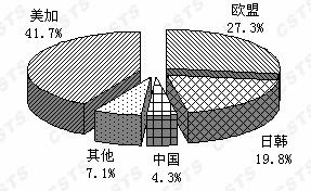 如果把38个国家按地缘特征进行简单归类,可以发现美国-加拿大、欧盟15国、日本-韩国构成世界R&D经费支出的三极,三方分别占R&D经费支出总额的42%、27%和20%。非常明显,中国在除三极之外的国家中占据着最重要的地位。