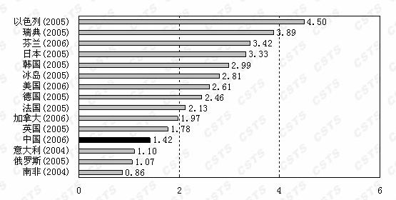 从R&D经费投入的强度来看,上世纪90年代,我国R&D/GDP增长缓慢,1999年以后这一比值开始迅速提高,2006年,我国的R&D经费强度为1.42%,在发展中国家中处于首位。