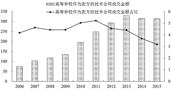 2015年,高等学校作为卖方在技术市场签订技术合同5.7万项,比上年上升了5%,占全国技术合同的18.6%;技术合同成交金额为314.3亿元,与上年基本持平,仅占全国技术合同成交金额的3.2%。