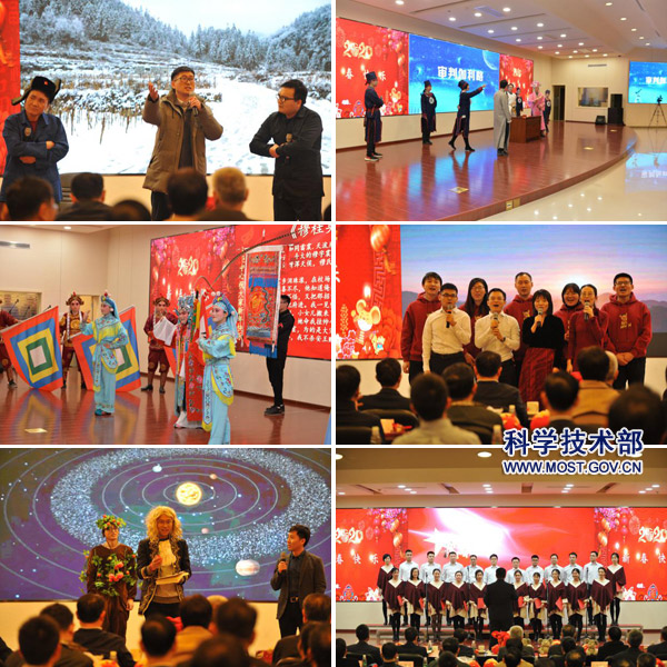 团拜会上科技部干部职工表演了精彩的文艺节目,展现了奋发有为、团结和谐的良好精神面貌。离退休干部局选送的节目《映山红》用优美的舞姿展现革命历史,以熟悉的旋律激励人心。人才中心编排的情景剧《科技人才畅想曲》,以诙谐幽默的语言展现了科技管理干部“忠诚、担当、专业、务实、守正”的良好形象。“根在基层”调研团的歌舞表演《根在基层,奋斗逐梦》,彰显了青年干部“学用新思想、建功新时代”、为科技事业不懈奋斗的意志。战略院选送的情景剧《懒杨杨变知猪侠》用艺术的手法讲述了科技部扶贫干部激发贫困地区创新创业活力、帮助贫困人口脱贫致富的精彩故事。中信所的舞台剧《审判伽利略》聚焦400多年前探索真知的故事,鼓舞大家以恒心追求真理,把红心奉献祖国。火炬中心的折子戏《穆桂英挂帅·出征》,展现了巾帼英雄穆桂英的英勇气概。新入职公务员通过歌舞表演《我们都是追梦人》,展现了年轻干部追逐科技强国之梦的满腔热情。高技术中心的情景剧《奇妙之旅》以创新的表演形式,深刻揭示了伟大事业源于实干的真理。机关各司局代表的合唱《我和我的祖国》,表达了科技部干部的拳拳爱国之心和实现科技强国的坚定信心。节目最后,王志刚部长等部领导走上舞台带领大家齐声高唱《我们走在大路上》,将团拜会推向高潮。