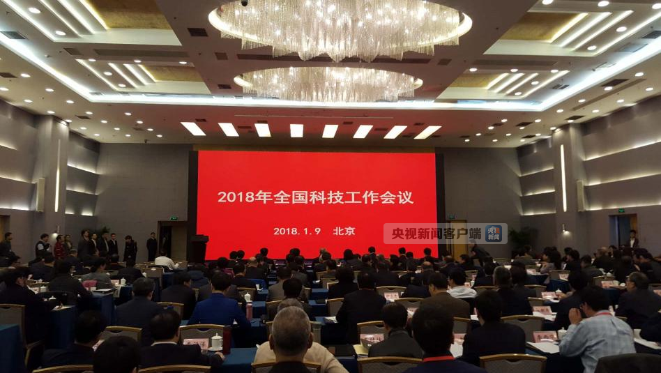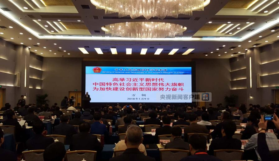 1月9日上午,2018年全国科技工作会议在北京开幕。科学技术部部长万钢作题为《高举习近平新时代中国特色社会主义思想伟大旗帜 为加快建设创新型国家努力奋斗》的报告。来自全国各地方科技管理部门、中央国家机关、民口国家科技重大专项实施管理办公室,科技部领导及各部门负责人、驻外科技参赞参加会议。(央视记者 李峥)