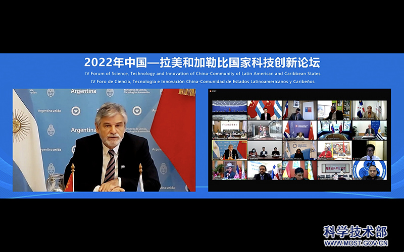9月2日,2022年中国-拉美和加勒比国家科技创新论坛(简称“中拉科技创新论坛”)以视频方式举行。本次论坛以“科技赋能共同发展,团结协作构建美好未来”为主题,由中国科技部和拉共体轮值主席国阿根廷科技创新部共同召开,中国科技部部长王志刚和阿根廷科技创新部部长丹尼尔·菲尔穆斯做主旨发言。阿根廷、玻利维亚、智利、哥伦比亚、哥斯达黎加、古巴、厄瓜多尔、萨尔瓦多、圭亚那、牙买加、墨西哥、尼加拉瓜、巴拿马、秘鲁、多米尼加、苏里南、特立尼达和多巴哥、乌拉圭、委内瑞拉、巴哈马、危地马拉、洪都拉斯、巴拉圭等20多个拉美和加勒比国家科技部门负责人在线与会发言。