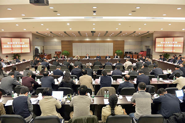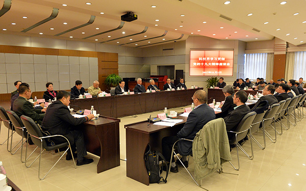 王志刚书记首先传达了党的十九大精神和十九届一中全会精神,传达了习近平总书记在中央政治局第一次集体学习时的重要讲话精神,传达了刘延东副总理在国家科改领导小组第二十七次会议上对学习贯彻党的十九大精神的有关指示要求。