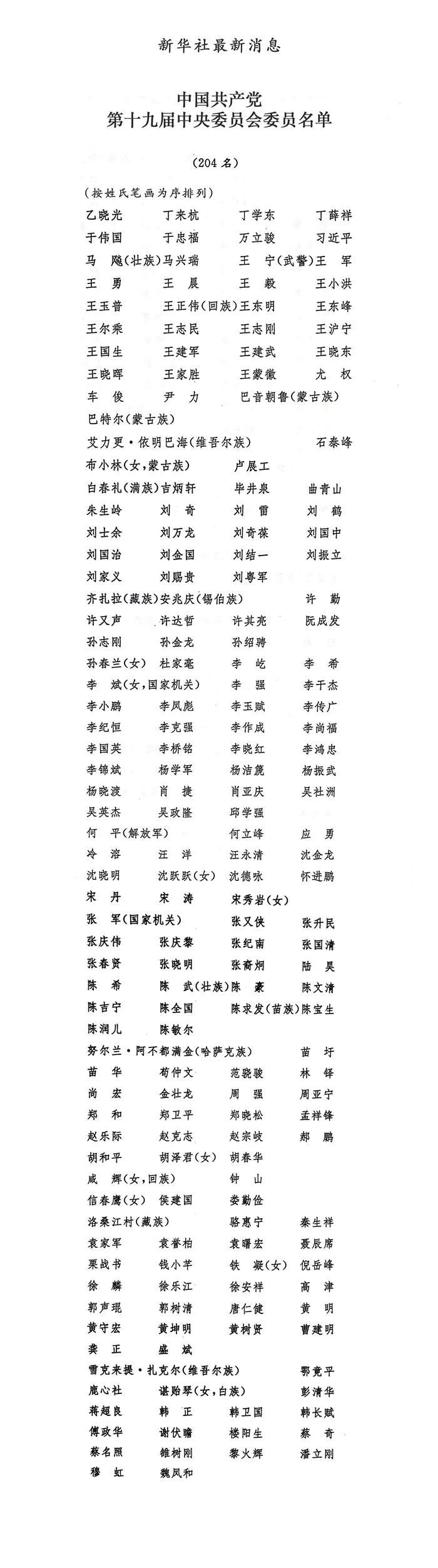 中国共产党第十九届中央委员会委员名单
