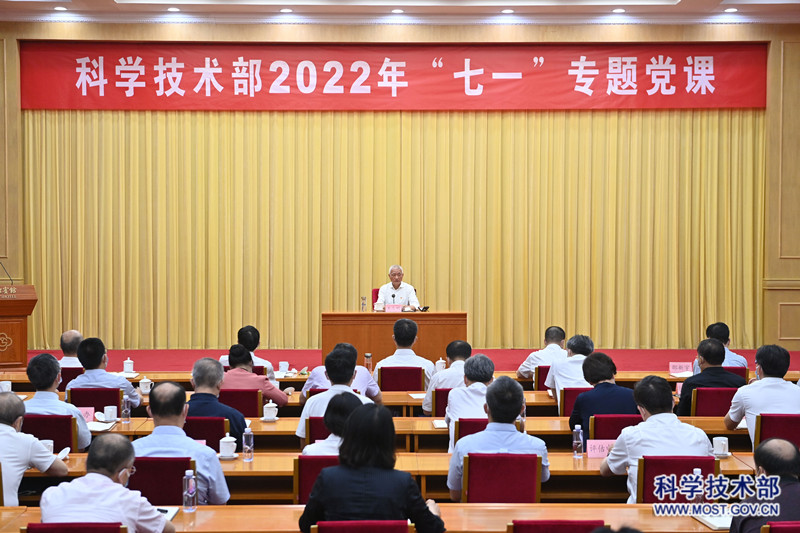 为庆祝中国共产党成立101周年,迎接党的二十大胜利召开,7月13日下午,科技部党组书记、部长王志刚以“拥护‘两个确立’走好第一方阵 以科技自立自强有力支撑现代化强国建设”为题讲授“七一”专题党课,引导部系统广大党员干部更加深刻认识“两个确立”的决定性意义,赓续和弘扬伟大建党精神,进一步坚定科技自立自强、建设科技强国的信心和决心,以昂扬奋进的精神状态走好第一方阵,营造喜迎党的二十大胜利召开的浓厚氛围。部党组成员、副部长,国家外国专家局局长,机关党委书记李萌主持会议。副部长张雨东,党组成员、副部长张广军、相里斌、邵新宇,党组成员、科技日报社社长张碧涌,党组成员林新出席会议。