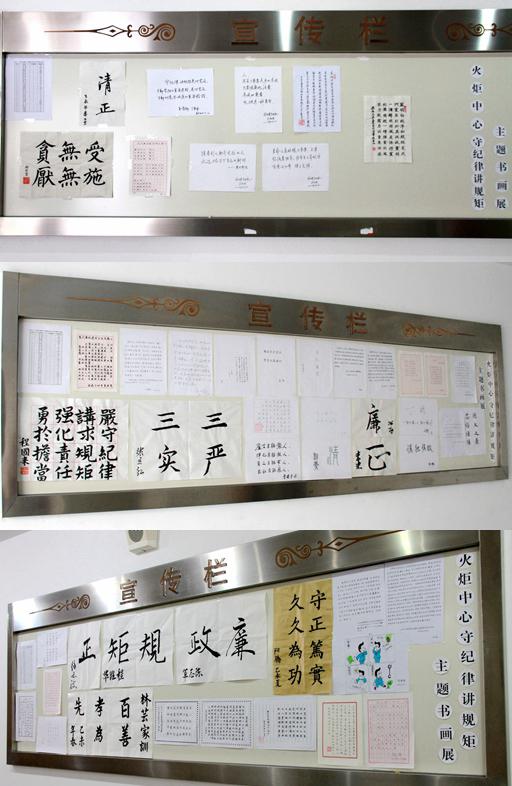 根据中心“守纪律 讲规矩”党风廉政宣传教育月的工作计划和安排,火炬中心举办了以“守纪律 讲规矩”为主题的书画展。