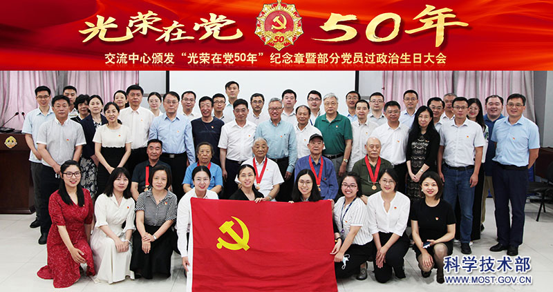 为庆祝中国共产党成立100周年,6月30日,交流中心举行“光荣在党50年”纪念章颁发仪式暨部分党员集体过政治生日大会,向中心老党员代表颁发“光荣在党50年”纪念章,为6-7月入党的党员过政治生日。中心老党员代表,科技部机关党委、离退休干部局和科技部第三巡视组有关领导,中心离退休党支部支委代表以及全体在职党员参加大会。